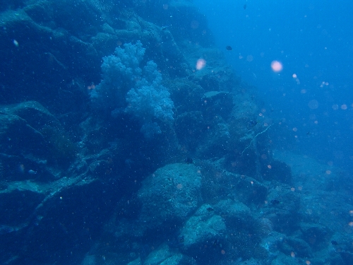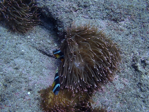 根の上はクマノミ、ミツボシクロスズメダイ、キンギョハナダイが。。。