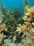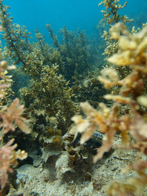 海藻の茂みの缶に隠れるニジギンポ