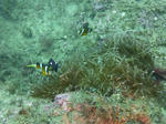 クマノミの子供とミツボシクロスズメダイ。