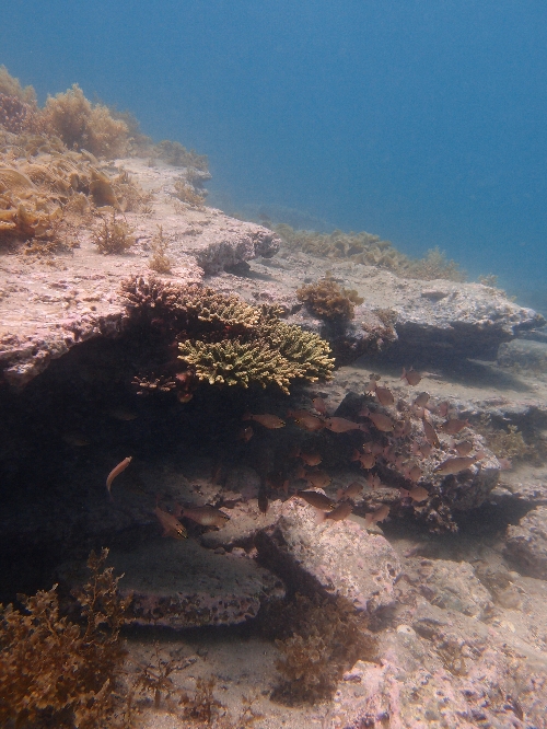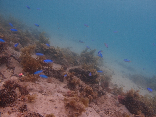 サンゴの下にはたくさんの魚が群れていました♪