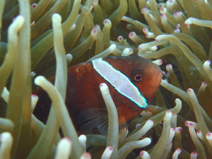 ツキチョウチョウウオ、ハマクマノミ、クマノミの幼魚、