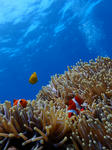 クマノミの子供とミツボシクロスズメダイ。