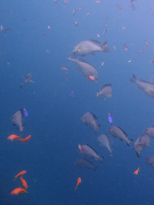 透明度も抜群で浅場では、ソラスズメダイやキンギョハナダイが群れ群れ♪