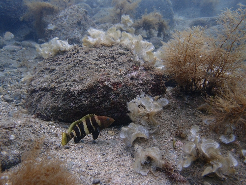 海藻の近くにはちっちゃなカワハギの赤ちゃんや