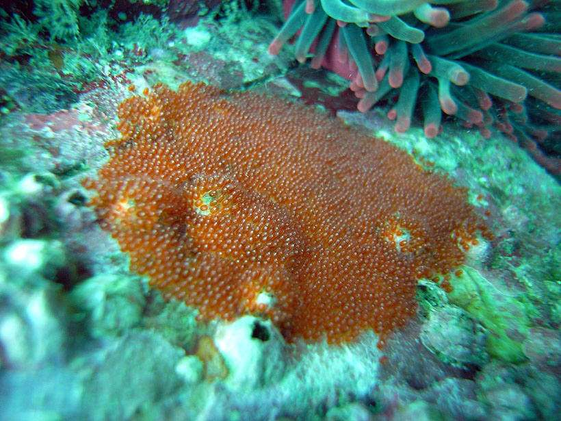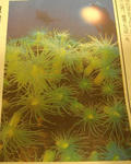 黄色い蛍光色に見える深場にいるイソギンチャクです。